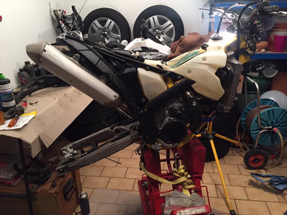 Schwingenlager neu, Kettenführung komplett neu, Kühlerlüfter neu, Kühlerschläuche neu, Carbon Abdeckungen drauf gemacht. Fahrwerk ist gerade beim Umbau. Felgen habe ich auch schon welche gefunden. 4 Kolben Bremsanlage von Beringer liegt auch schon bereit.