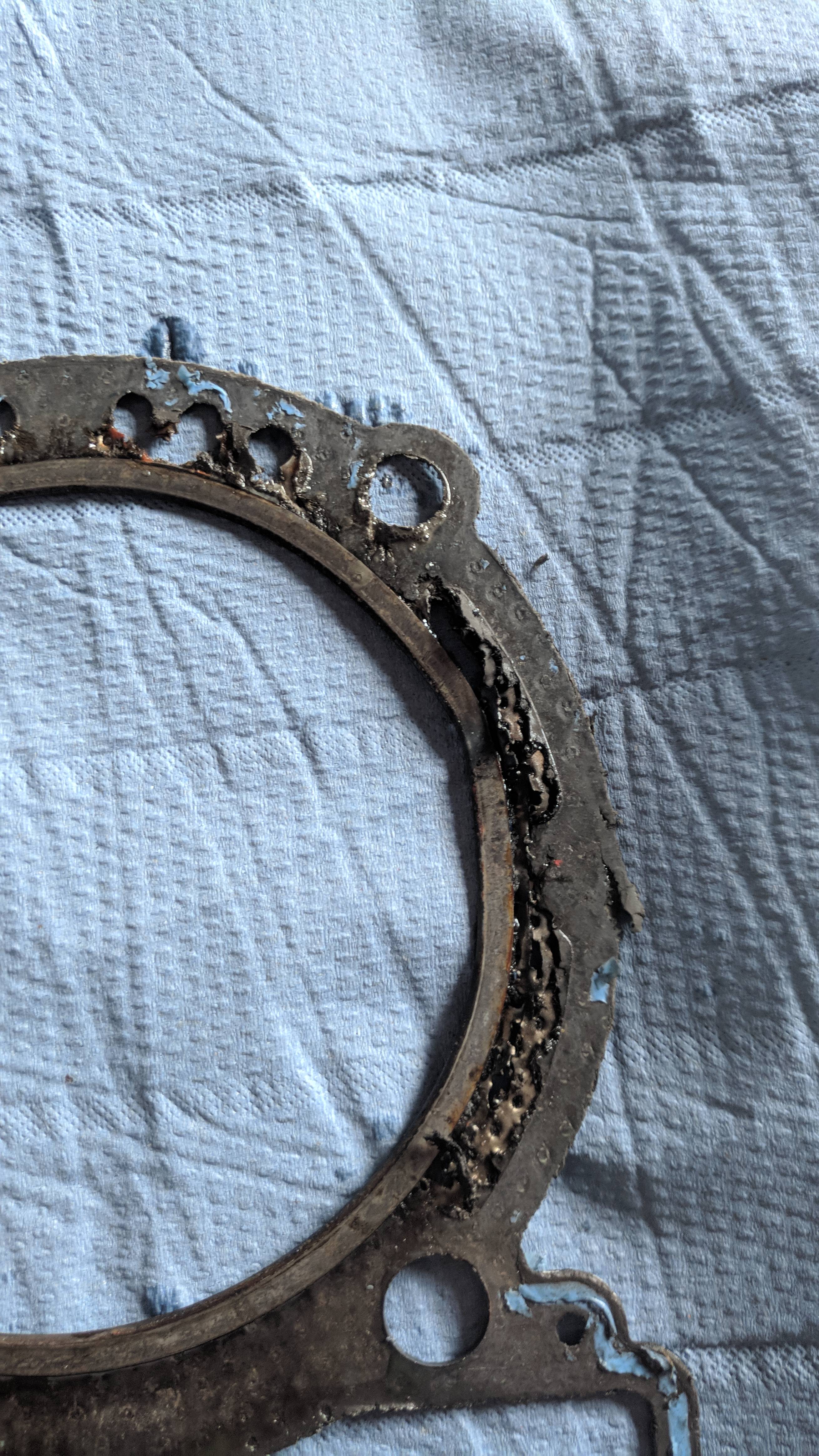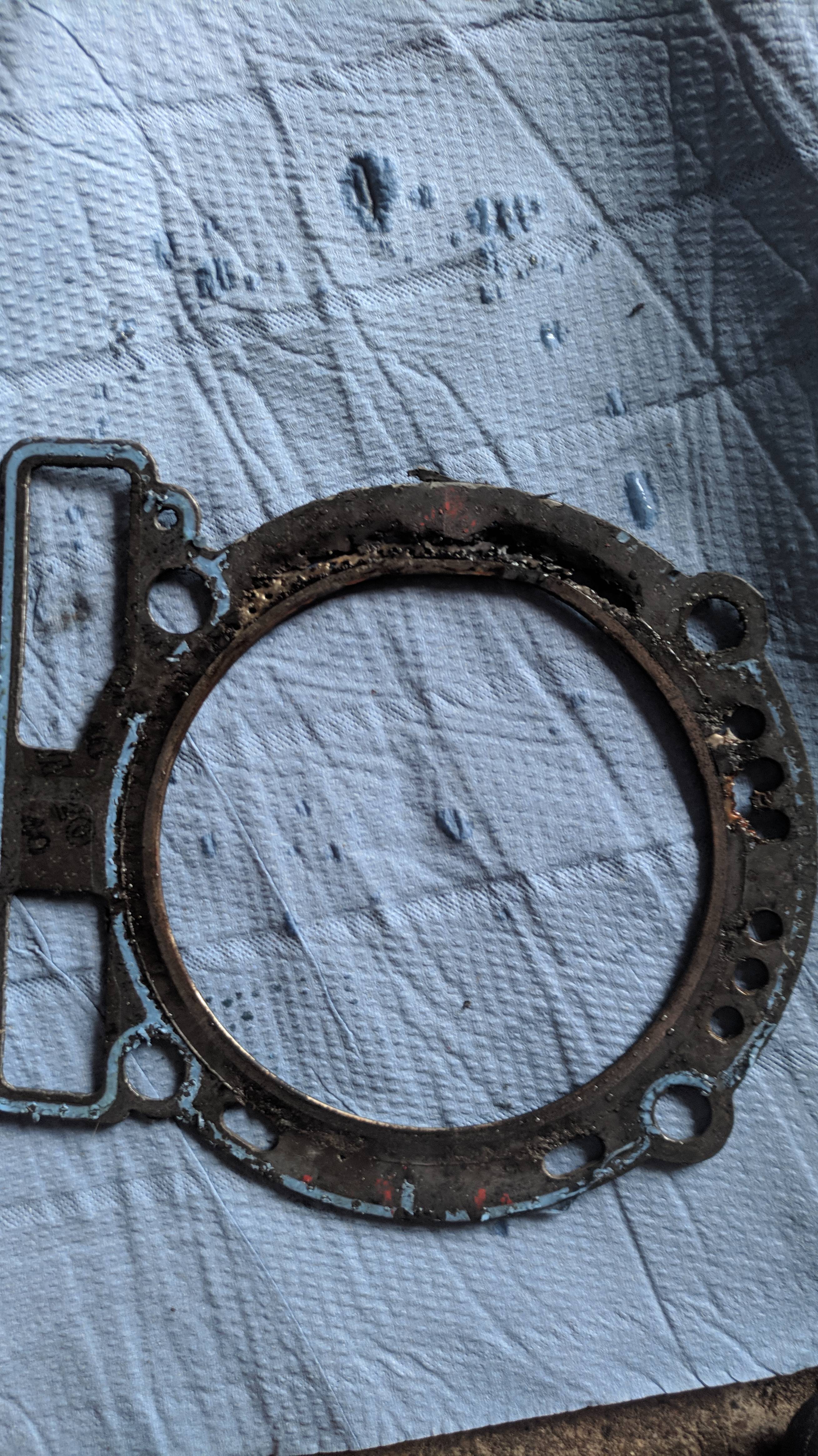 Nach der Motorrevision habe ich die Husaberg ca. 2 max 3 Minuten ohne kühler laufen lassen, um zu sehen ob das gröbste funktioniert. Hatte dann gesehen, dass aus der Wasserpumpe öl kommt, mein Fehler, ich hatte den O-Ring zwischen dem Kupplungsdeckel und dem Gehäuse vergessen, also aufgemacht und eingesetzt. Danach komplett zusammengebaut, den Kühlkreislauf mit Wasser 4 mal durchgespült und dann wie gesagt ca 2. Bh gefahren. Habe dann im Vergleich auch gemerkt, dass die FE550 zu der 550 meines Kumpels schlechter anzieht. Nachdem ich dann den Zylinderkopf nachgezogen habe hat sich nach den ersten paar Kicks das Motoröl mit Kühlwasser vermischt (konnte man an Schauglas sehen). Heute also Öl abgelassen, alles auseinandergebaut und siehe da Kopfdichtung komplett kaputt, der Brennraum komplett mit Wasser gefüllt und die Krümmer auch voller Wasser. Der Ölsieb hatte auch Metallsplitter, vielleicht von der Kopfdichtung oder auch vom Einfahren? Heute also Kopfdichtung gewechselt, aber noch nicht wieder den Motor gestartet.