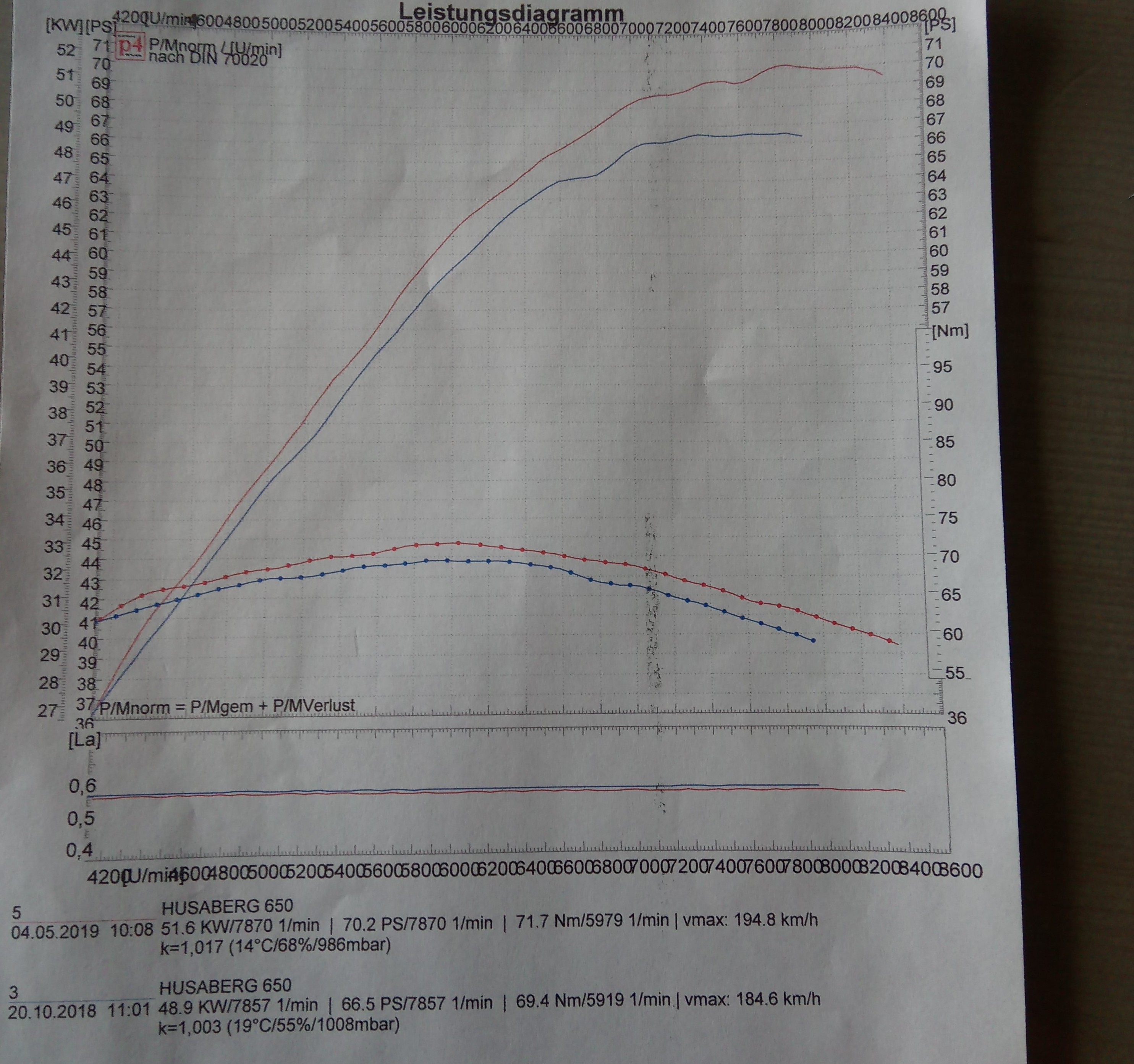 Ach übrigens, Dynojet Prüfstände geben laut Software immer die Radleistung an, dann kann man nochmal die Verlustleitung errechnen lassen. Das Drehmoment hätte beim Blinden höher sein können, 650 er sollte eigentlich auch gute 70 NM mit dem Umbau raushauen. Meiner 600 er hatte mit der SR- Racing Einrohr Anlage schon knapp 70 NM. -