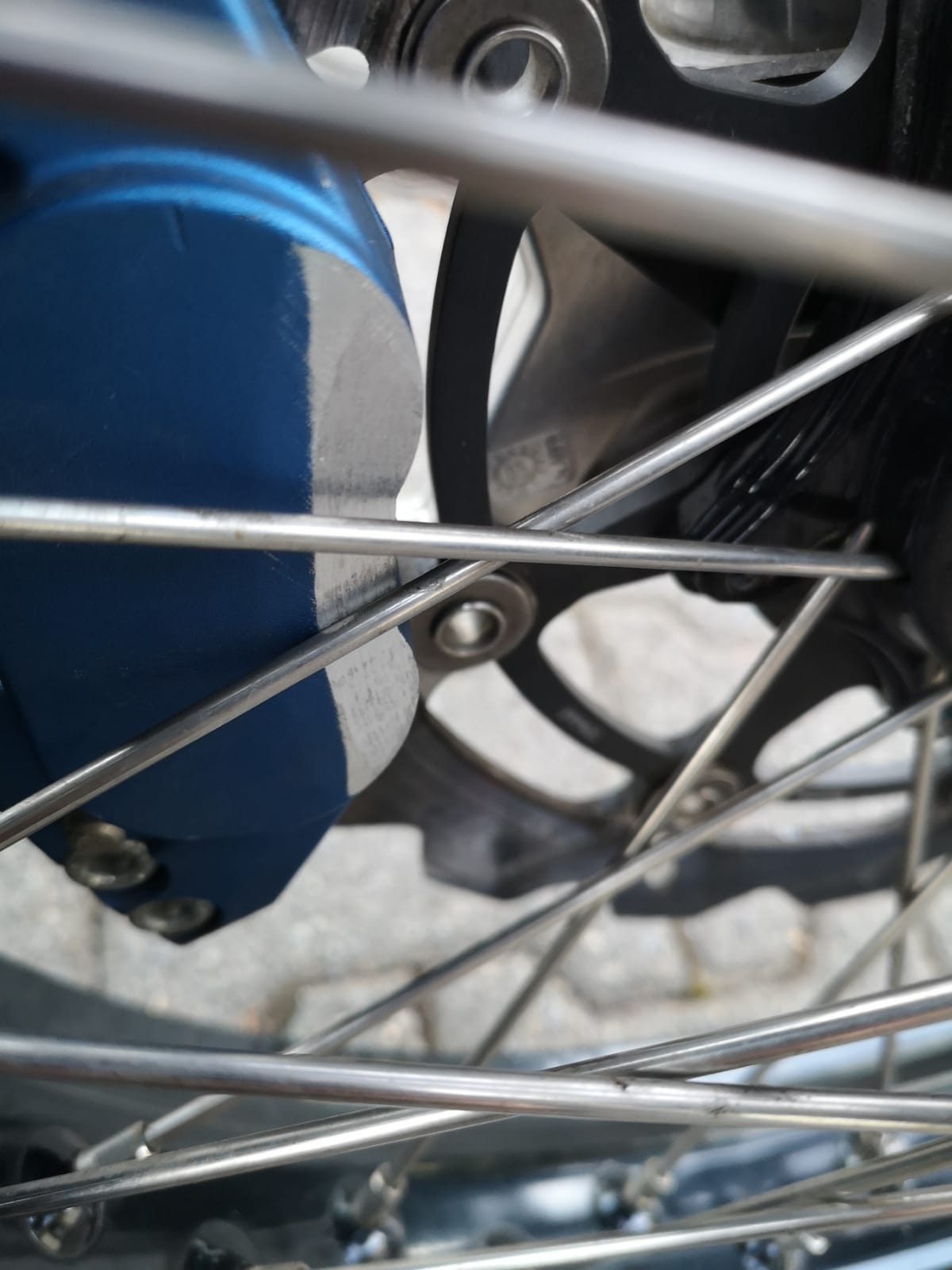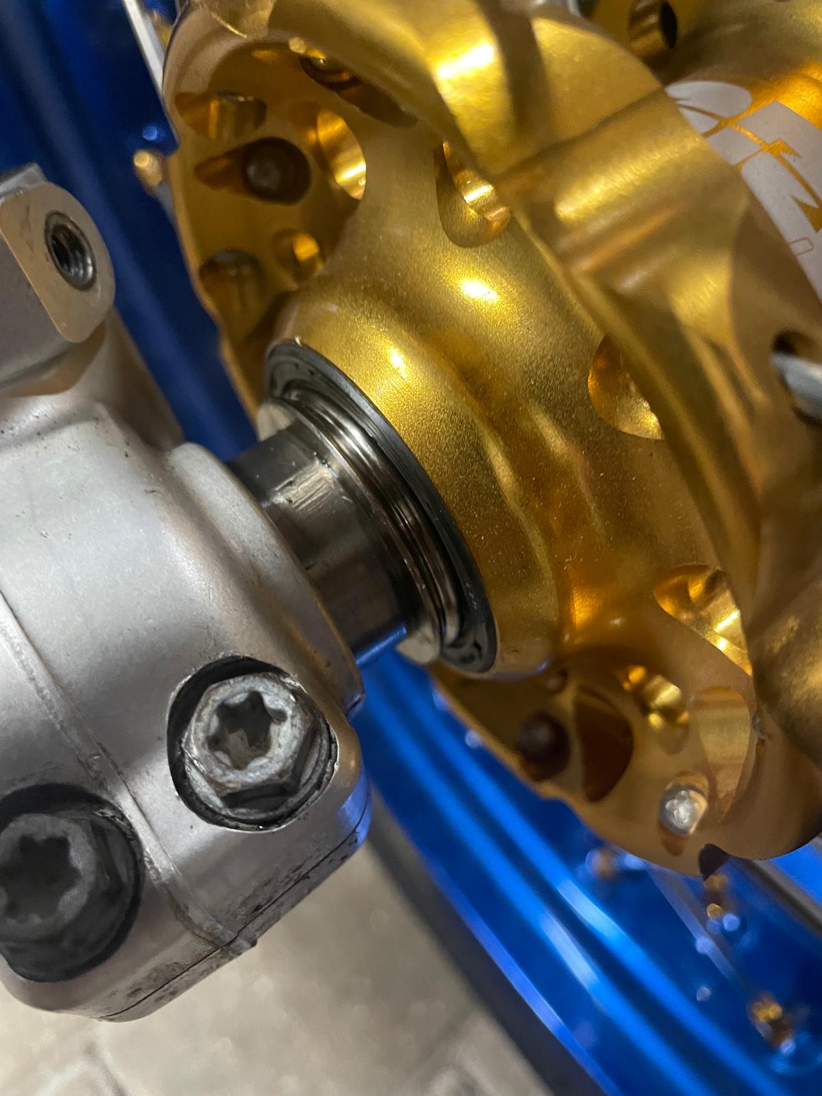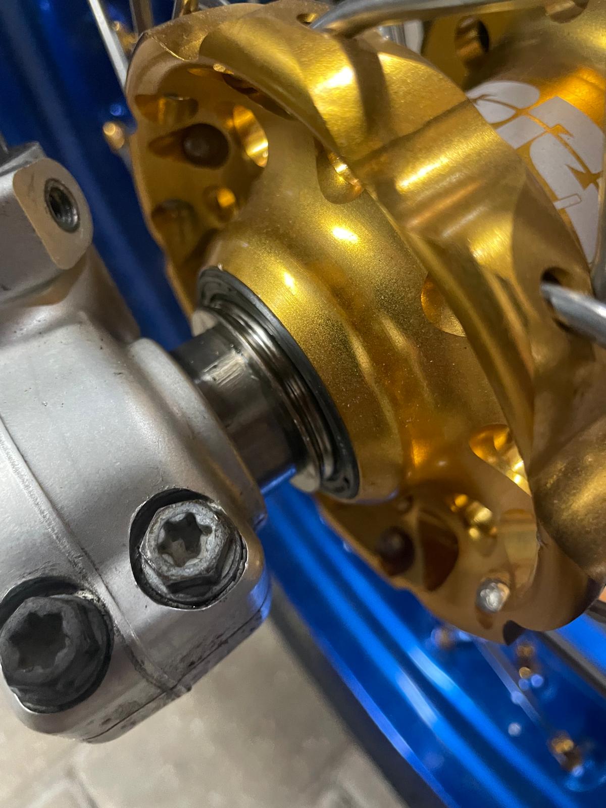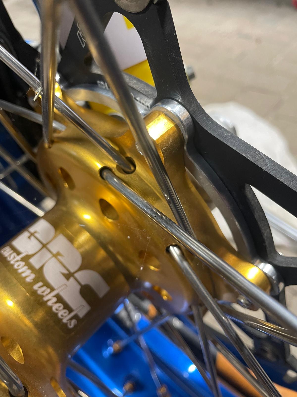 • Ich hab einen Distanzring bremsseitig zwischen Distanzhülse und Gabel so eingepasst, dass der Bremssattel zu den Speichen etwas Luft hat (ca. so wie original). Stärke Distanzring ca. 1,6mm und dann mit einer Distanzscheibe Marke Eigenbau mit 2,6 mm die Bremsscheibe in die Sattelmitte ausgerichtet. Was n kakk.