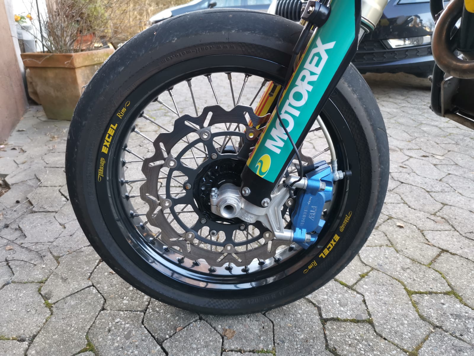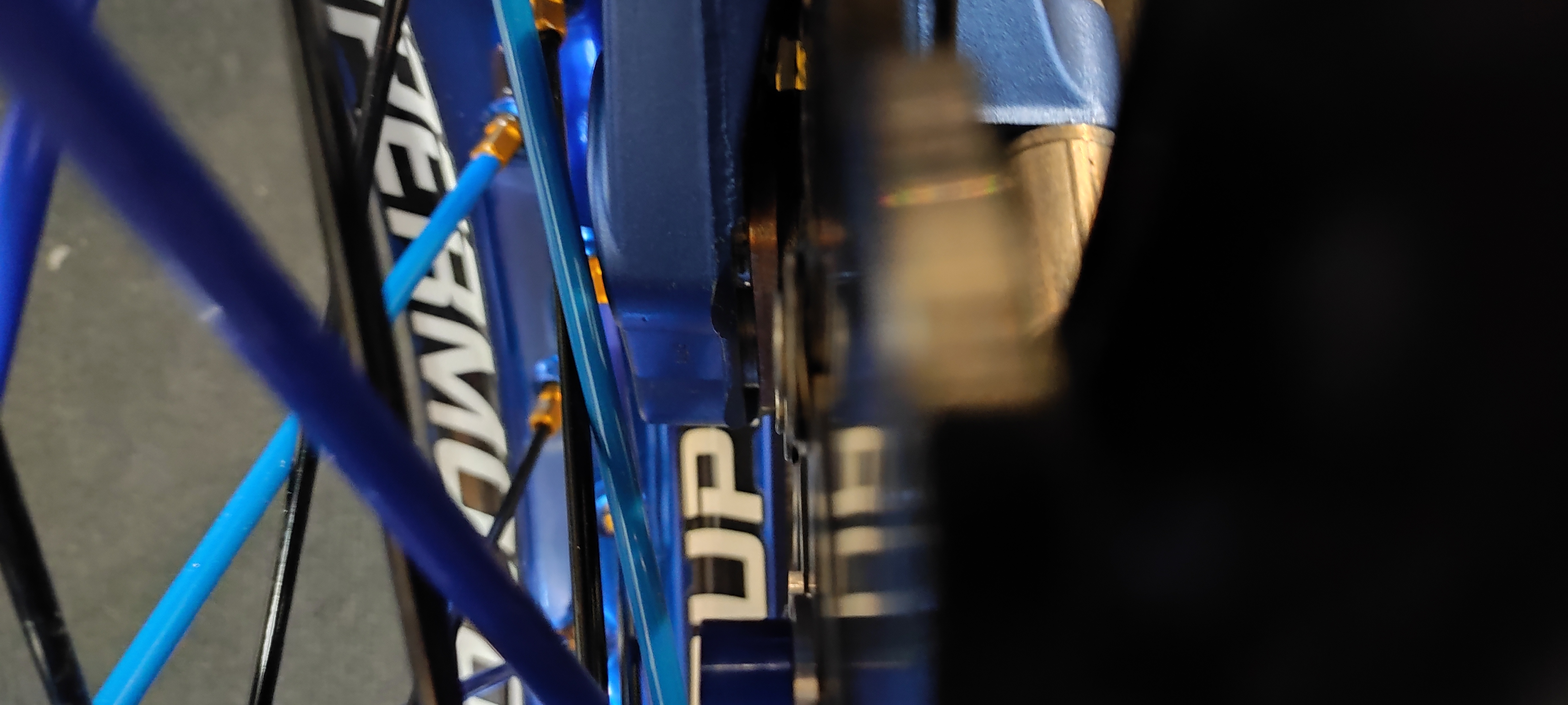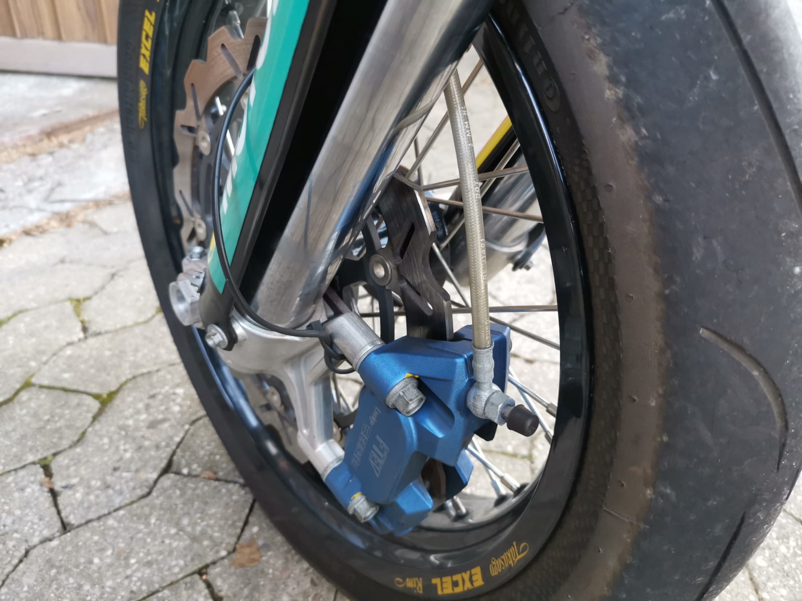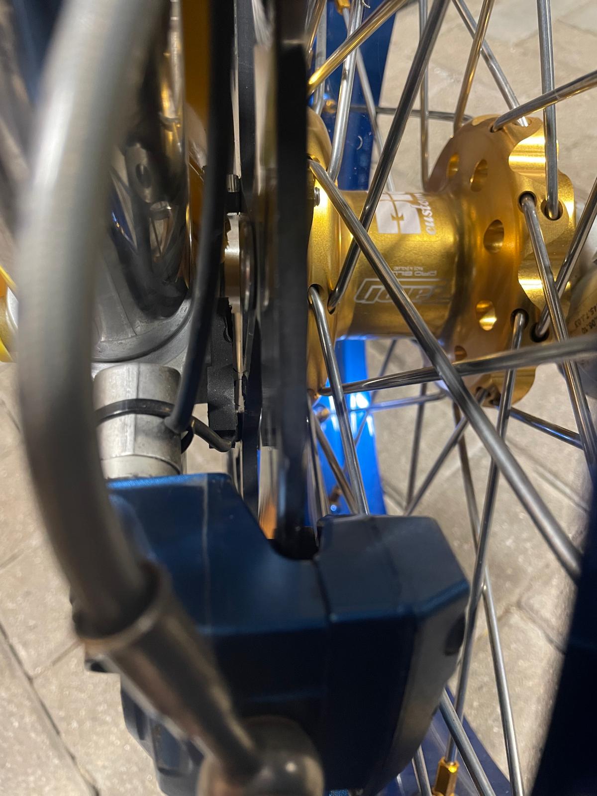 habe Excelfelgen gekauft. Durch das breitere Lochbild in der Felge sitzen die speichen weiter aussen - dadurch kratzt der FTEb Sattel an den schönen, neuen schwarzen Speichen. Die Bremsscheibe scheint aber richtig positioniert zu sein. Auch den Sattel mit 5mm Distanzhülsen weiter raus schieben hilft nicht wirklich. Jetzt kratzt noch eine Speiche. Bei Kurvenfahrt wird das bestimmt nicht besser.