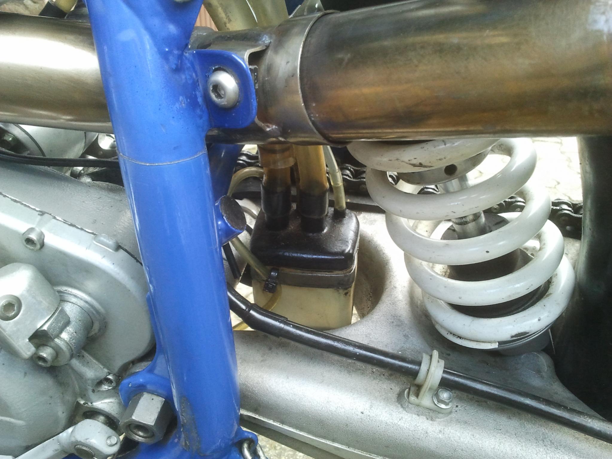 zum Schlauch: Das ist die Kurbelgehäuseentlüftung. Original wird die über einen trichterförmigen Gummi mit Schaumstoffeinsatz an den Rahmen angeschlossen. Nachteil: Ölnebel gelangt bis zum Vergaser. Besonders unangenehm bei einem Sturz, denn dann läuft das heiße Öl direkt bis zum Vergaser und Du kannst das Starten erstmal vergessen. Die Luft muss abgeführt werden und sollte auch gefiltert werden, denn der Motor kann kleine Partikel über diese Leitung ansaugen! Wie bei einem Luftfilter.
