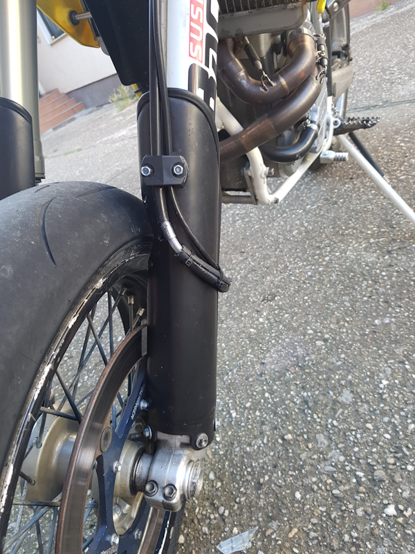 Jetz habe ich ein paar Fotos im Netz gesucht und gesehen, dass bspw bei KTM die Leitungen außen an der Gabel vorbei zum Bremssattel und Tachogeber laufen...