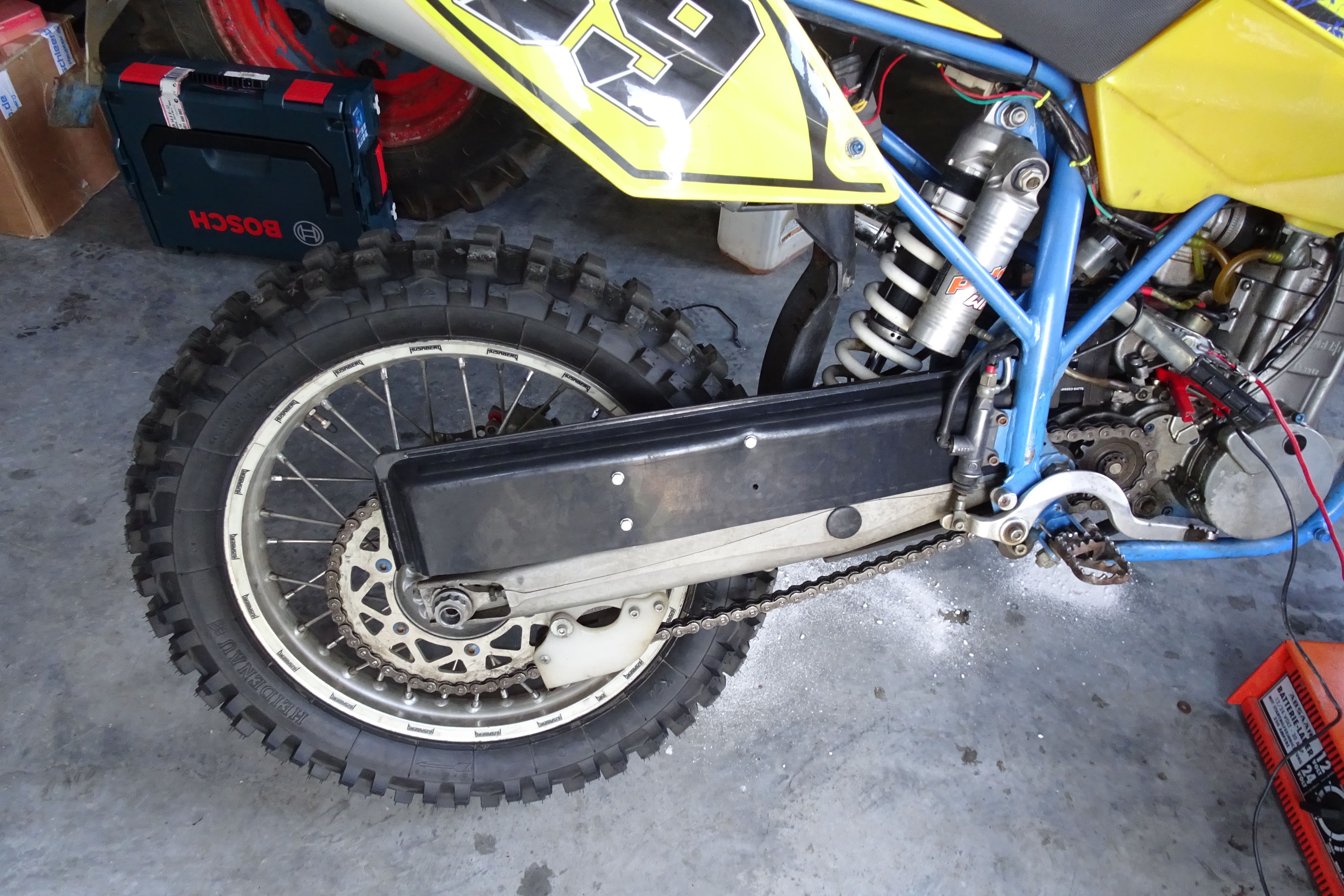 Den Kettenschutz habe ich mir dann letztendlich aus einer alten Plastikölauffangwanne (nicht schön aber wirkungsvoll, siehe Bild) selber gebaut. Die Maschine ist jetzt auch durch den TÜV. Der Prüfer hatte allerdings angemerkt, dass wenn ich mal einer Polizeistreife vorbei fahren sollte, den Gashahn bitte nicht zu weit aufdrehen.