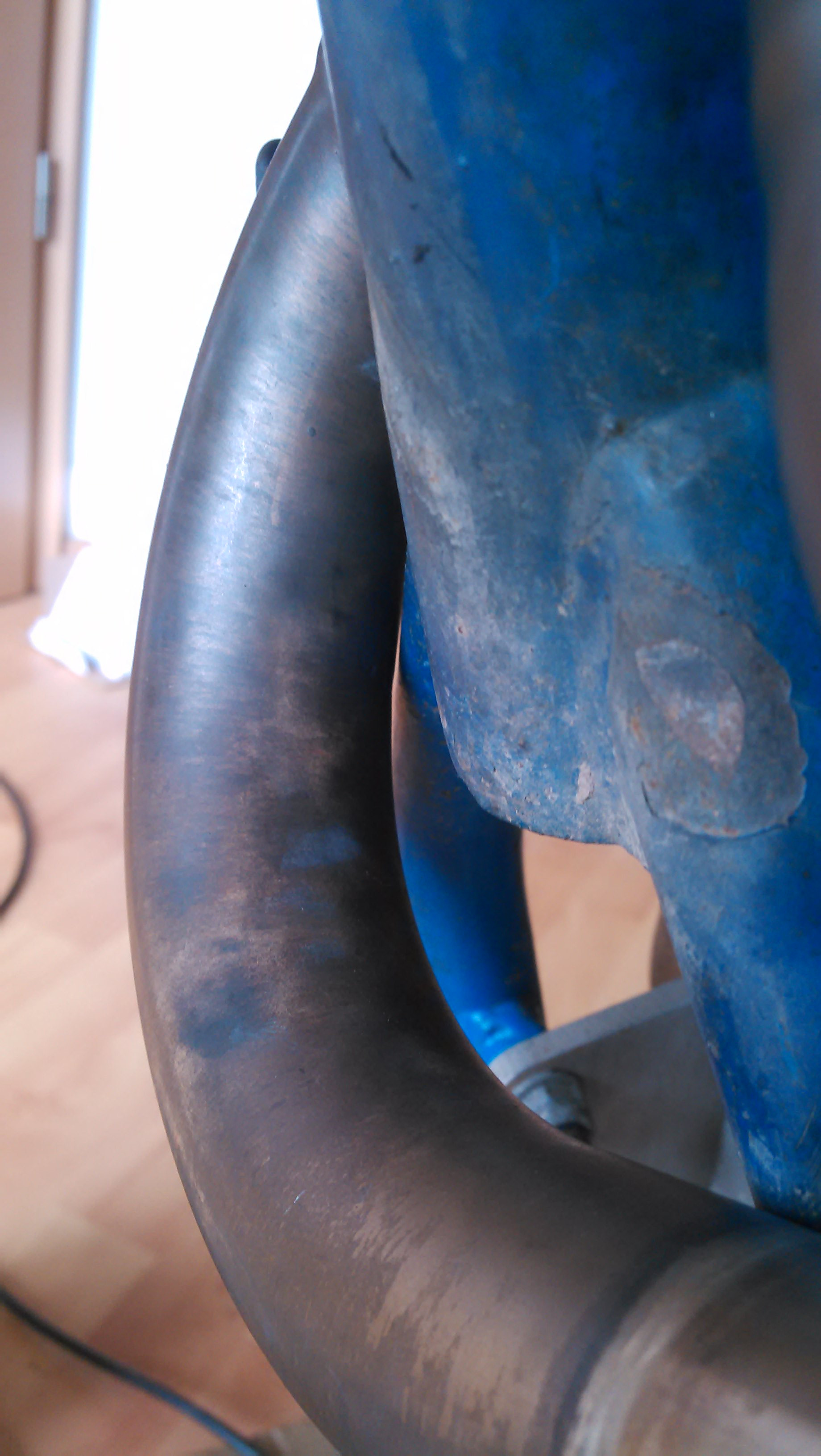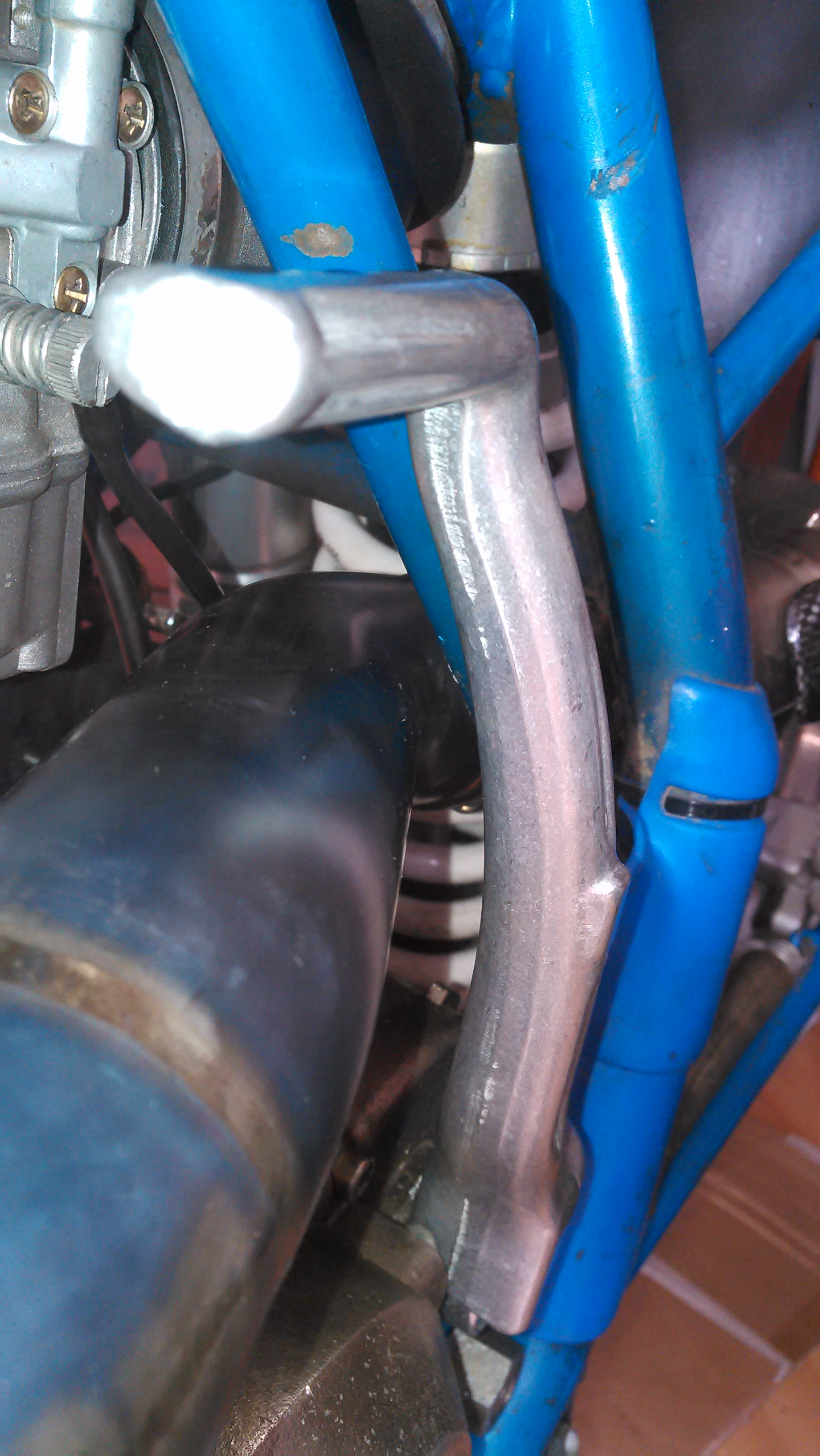 Der Kickstarter ab 2004 löst tatsächlich das Problem! Die Krümmer liegen vorne fast am Rahmen an. Den Spuren sm Rahmen nach zu urteilen war das beim Originalkrümmer auch so. Das gefällt mir gar nicht!